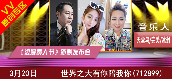 简介:通过举办由天堂鸟作词,音乐人完美和冰封演唱的《浪漫情人节》新歌发布会,宣传原创音乐,展现原创音乐词曲人风采 ,让更多喜欢爱好音乐的朋友欢聚一起,培养网络原创音乐人,丰富朋友们的业余文化生活,以推动网络原创音乐的发展。