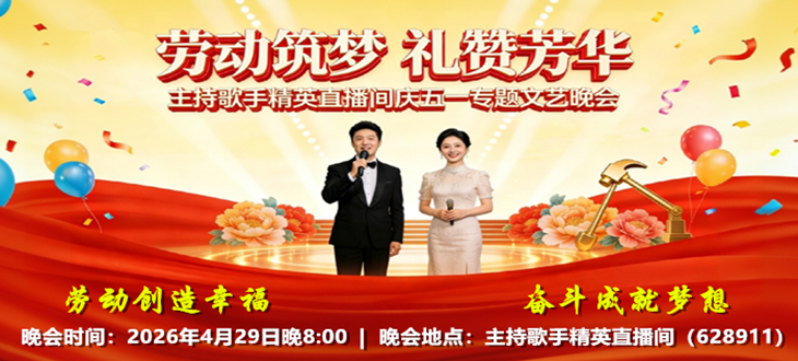 简介:为庆祝五一国际劳动节,致敬广大劳动者,主持歌手精英直播间特举办本次晚会。以歌声传递温暖,用主持营造氛围,为观众献上一场精彩的视听盛宴,丰富网络节日文化生活。晚会弘扬劳动精神与奋斗正能量,赞美各行各业劳动者的辛勤付出,彰显劳动最光荣、奋斗最幸福的价值理念。同时增进与观众的互动交流,凝聚直播间人气,在欢乐祥和的氛围中共度佳节,让大家感受节日温暖,传承爱岗敬业、拼搏奉献的时代精神。