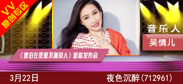 简介:通过举办词曲音乐人吴情儿《漂泊在夜里不睡的人》新歌发布会,宣传推广原创音乐,给喜欢音乐的网络朋友们展示自我的舞台,更好的丰富朋友们的业余文化生活。晚会活动围绕VV站树立一个健康,活泼,特色,和谐主导思想为目标。弘扬宣传原创作品音乐,展现原创音乐人的风采 ,让更多喜欢爱好音乐的朋友欢聚一起,展示推动更多更好的网络原创音乐。